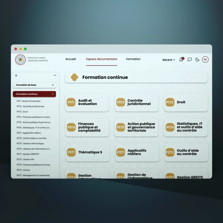 La plateforme de formation a permis une gestion centralisée et simplifiée des programmes de formation de la Cour des Comptes. Grâce à son interface conviviale et à ses fonctionnalités avancées, elle favorise le développement des compétences des collaborateurs tout en optimisant les ressources pédagogiques. En s’inscrivant dans la stratégie de transformation digitale, cette initiative renforce la capacité de l’institution à répondre aux défis de modernisation et d’innovation.